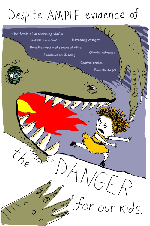 The cartoon illustrates the emotive and dramatic perspective that seems to motivate many people who are alarmed about global warming due to man. The fact that there is no observational evidence to support such alarm seems important to them. Some, I fear, actually want to believe in CAGW, and will do so even as 'hell and high water' fail to materialise. I am concerned about their impact on children, and hope to do a post on such extremists in the near future (http://climatelessons.blogspot.com/)
